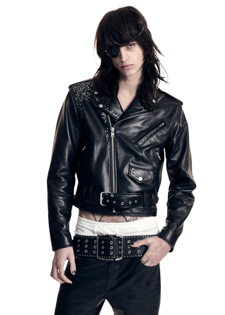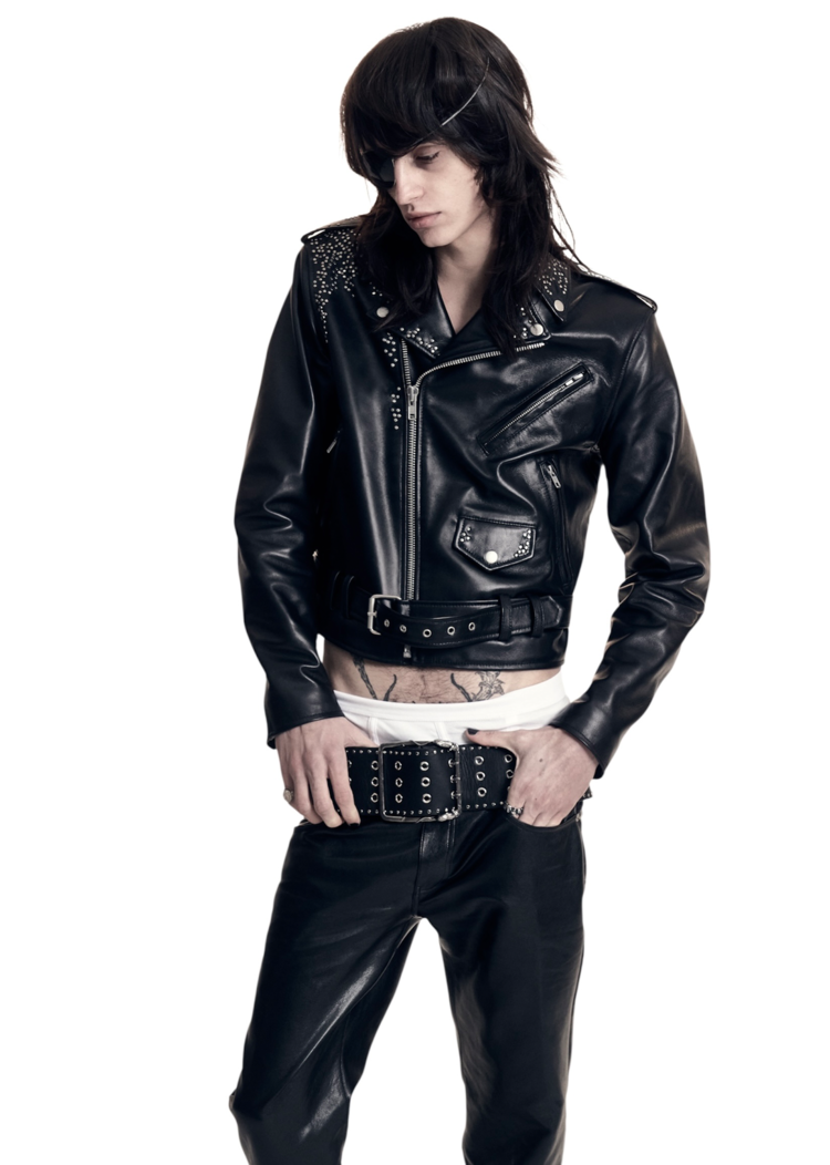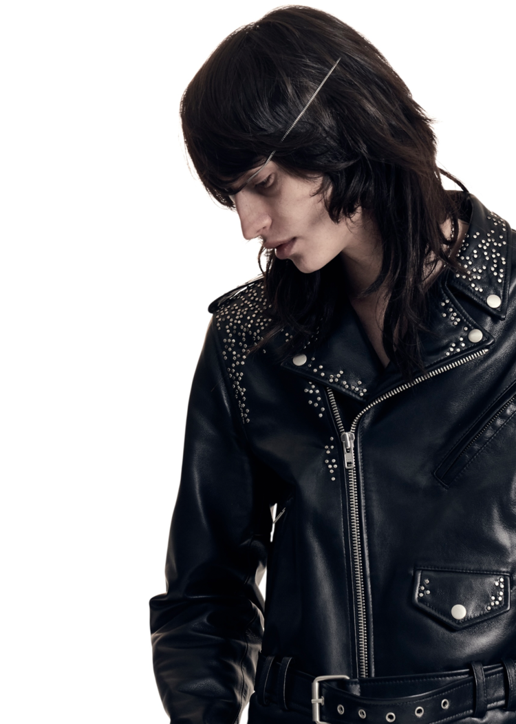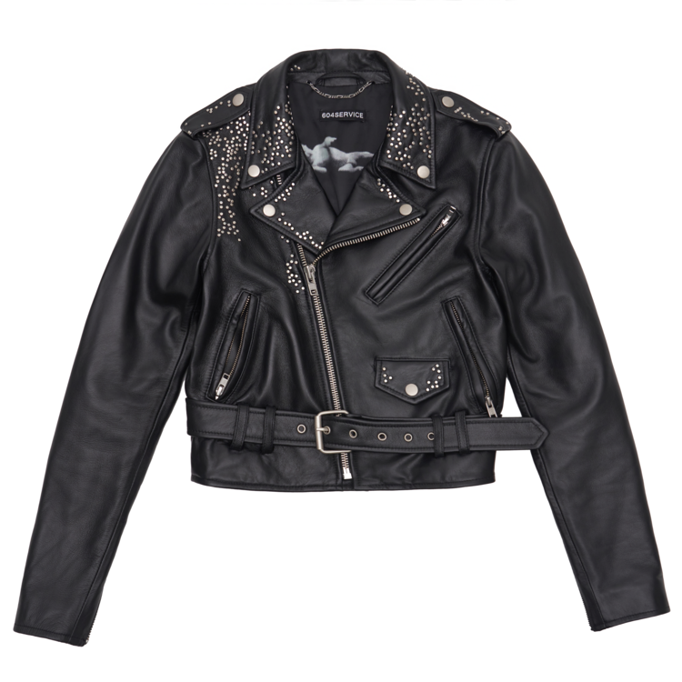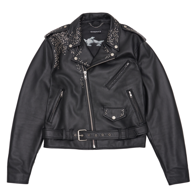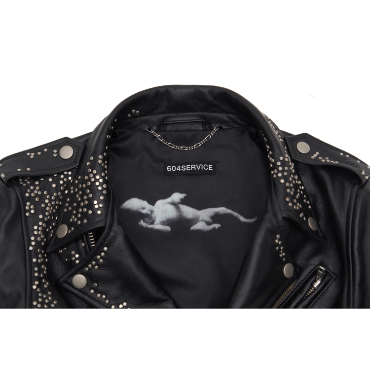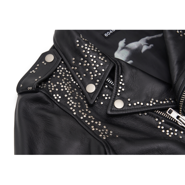 각 다른 워싱을 한 세 종류의 스터드를 불규칙하게 박은 디테일.